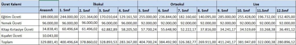 2025-2026 Eğitim Öğretim Yılı Fiyat Listesi